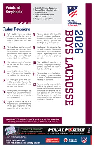 The NFHS is providing FREE Rules Revisions Posters for the new high school boys lacrosse season. If you are a coach, administrator, or state association representative, click the link below to download the PDF file.